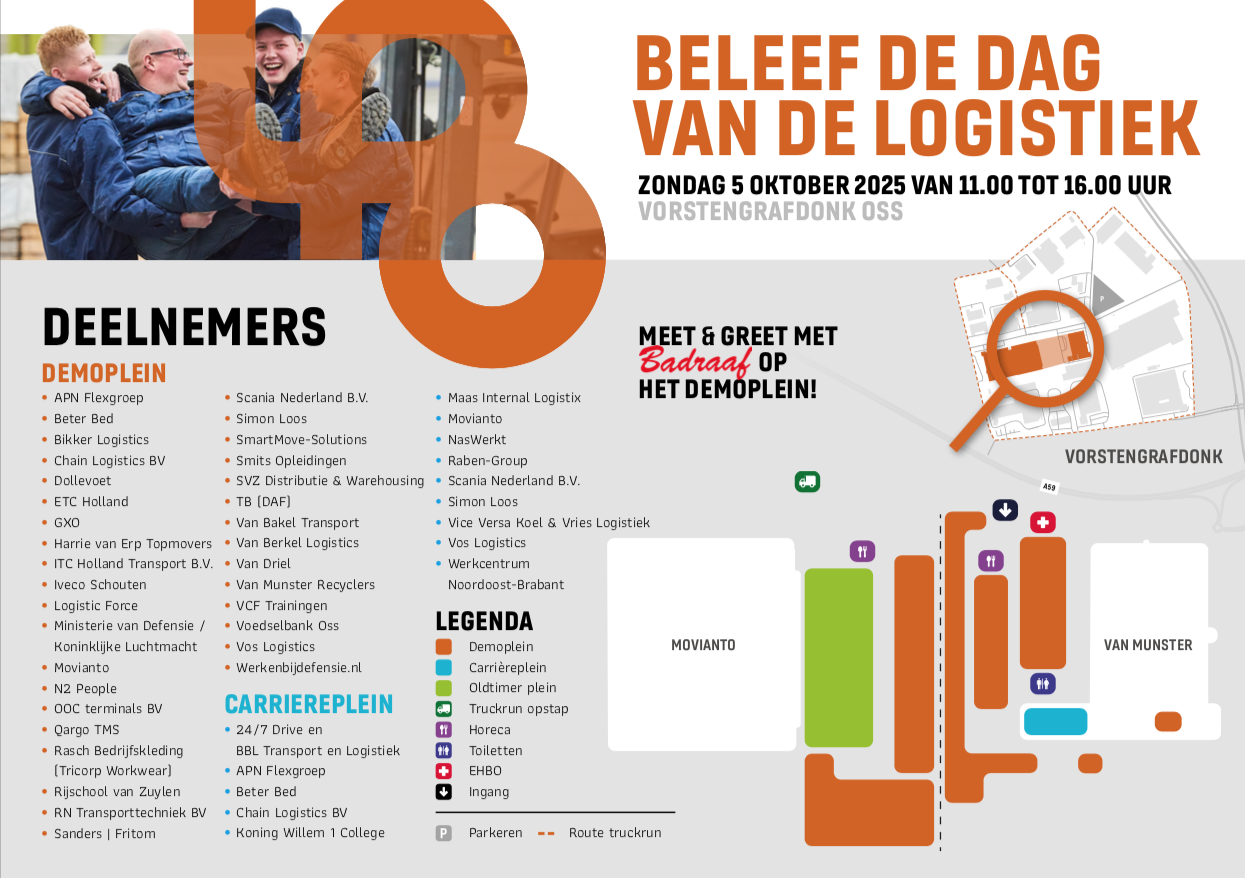 De Dag van de Logistiek wordt dit jaar voor de vierde keer georganiseerd door Logistiek Platform Oss, in samenwerking met een groot aantal logistieke bedrijven. Movianto en Van Munster Recyclers, buren van elkaar op bedrijventerrein Vorstengrafdonk, zetten hun deuren open voor een kijkje in de keuken. Andere logistieke bedrijven zijn aanwezig met een stand. Op het carrièreplein en het demoplein laten zij zien wat ze allemaal in huis hebben. Er zijn interessante demo’s en interactieve workshops en bezoekers kunnen ervaren hoe het is om als bijrijder in een vrachtwagen te rijden.